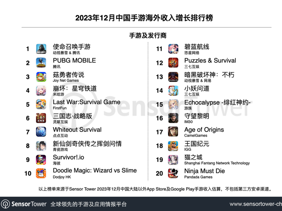 近日,第三方机构SensorTower发布了2023年12月中国手游出海手游收入榜单,一款名为《菇勇者传说》的手游空降收入榜第14位,并成为当月的海外收入增长季军。