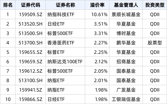 截至今日收盘,纳斯达克科技市值加权指数溢价居前,纳指科技ETF收盘溢价10.61%;日经225指数情绪高涨,日经ETF、日经ETF,分别收盘溢价3.51%、1.98%。