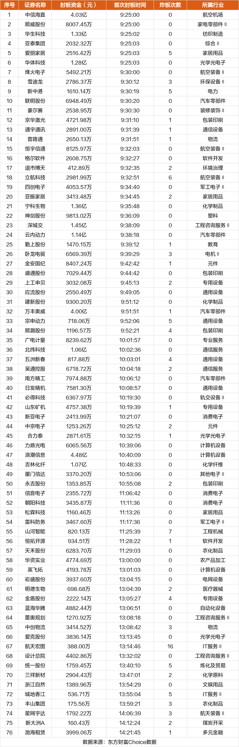 从首次封板时间角度看,今日76只非ST股中,烽火电子、雪迪龙、新中港等在开盘5分钟内首次触板。